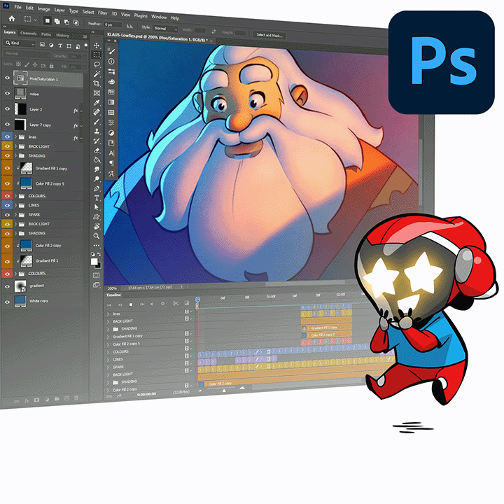 This file contains all the layers used to create this animation, including lines, colours, shading and effects as seen in the video above. Use Photoshop's Timeline to see the animation. Go to top menu: Window > Timeline